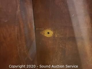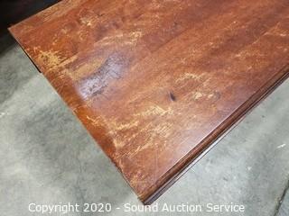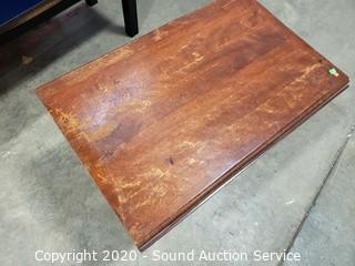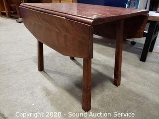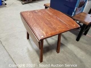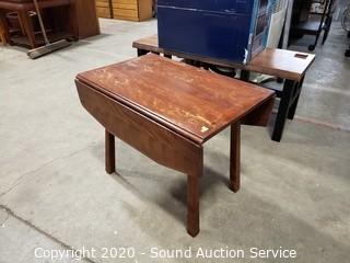 Lot Details: One leaf won't stay up because it is missing the wood support to hold it. Some wear to the finish, refer to photos. 21.5" x 28" x 18" with (2) 8" drop leaves.