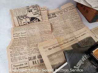 Lot Details: Includes 1945 114th Infantry discharge papers, photos, paper clippings, signaling mirror, dog tags, buttons, pins, pocket crucifix, bronze metal star medal & cigar box.