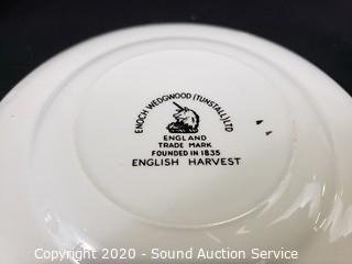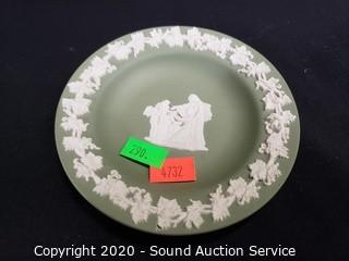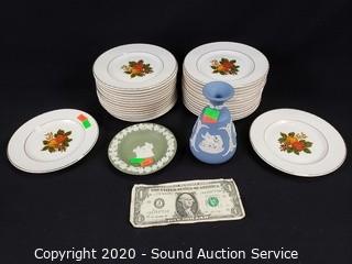 Lot Details: Includes 28 "Enoch" Wedgwood English Harvest 5.5" plates, green and blue jasperware "Cupid as Oracle" plate and vase.