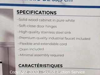 Lot Details: Solid wood cabinet, pure white, soft close door hinges, high quality stainless sink, premium quality industrial faucet and drain included, flexible and extendable cord. In original packaging. Item #1367218.