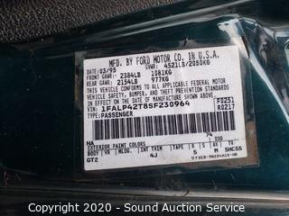 Lot Details: VIN# 1FALP42T8SF230964. Comes with signed & notarized affidavit of Loss/Release of interest & title. Odometer reads 234,064 miles (Haven't seen it change so may not be reading right). 5 speed manual transmission (shakes in 5th gear), 302 V8 5.0L OHV 16V Engine. Check engine light was coming on and off when we drove it to the shop, wipers need new blades, pulls to the right slightly, Don't believe AC is working, New battery with receipt & 3 year replacement, tires have some cracking (been sitting awhile). Has a BBK cold air intake. Power windows and locks all work, leather interior, radio & heater work, all lights work as intended. Was sitting under a tree, covered in sap.