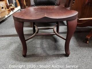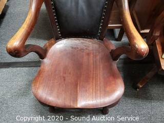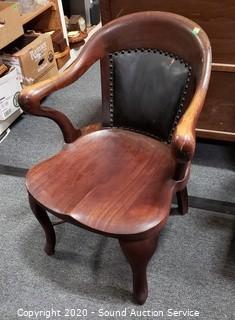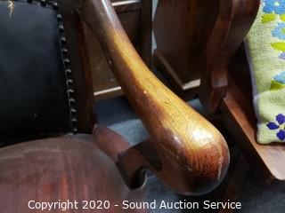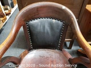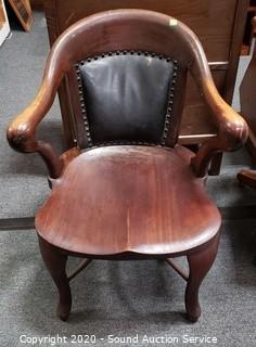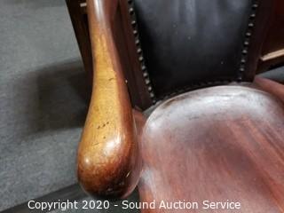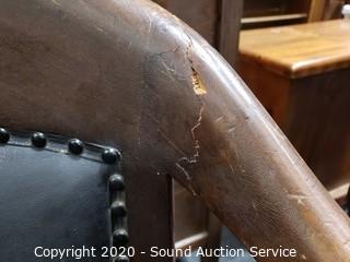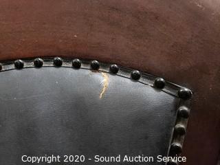 Lot Details: Nailhead padded leather back, contoured seat and arm rests (one arm rest has been repaired, refer to photos). 32" x 24", 16" to seat.