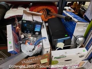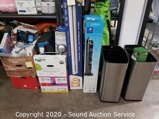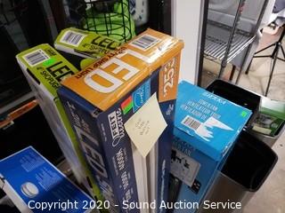Lot Details: Includes 4ft LED shop lights, Sierra tower fan, motion sensor trash cans, shower head, flush mount ceiling light, Hope Furnishing 3-light floor lamp, toilet seat, LED strip lights, security light, paper shredder, shower caddy and much more.