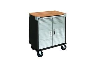 Lot Details: UHD20145B. Satin Graphite. Unassembled in original packaging. Dimensions: 28" W x 18" D x 34.5" H. Weight capacity: 300 lbs. (150 lbs. per shelf evenly distributed). Solid .75" thick hardwood top with chrome push-bar. Single height-adjustable shelf. Key-lock stainless-steel doors with UltraGuard. fingerprint-resistant coating. Hard rubber 5" wheels with heavy-duty metal casters. Commercial-grade steel. Powder-coated finish.