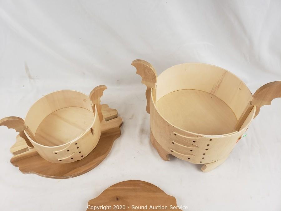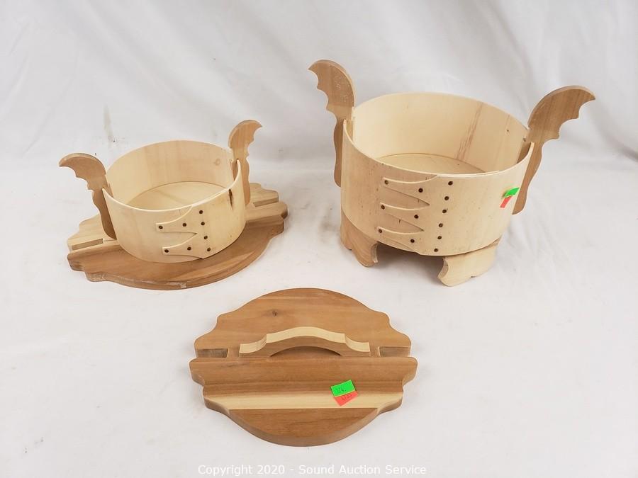 Lot Details: Lids tension latch closed. Well crafted, natural finish. 12" x 17" x 14.5" and 12" x 11" x 9". 5" x 19" x 6".