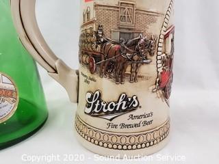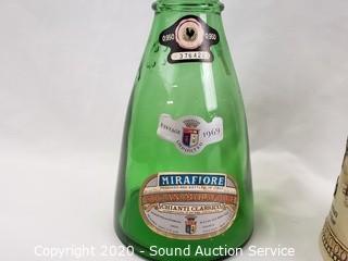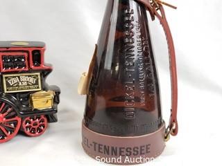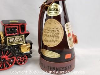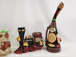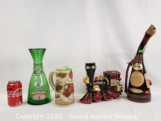 Lot Details: Includes Stroh's ceramic stein, Mirafiore Chianti Classico bottle, George Dickel Tennessee decanter and Ezra Brooks train decanter.