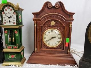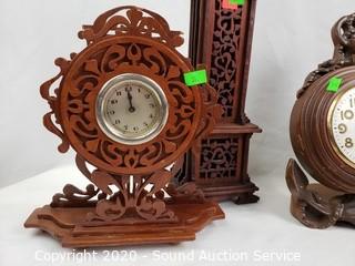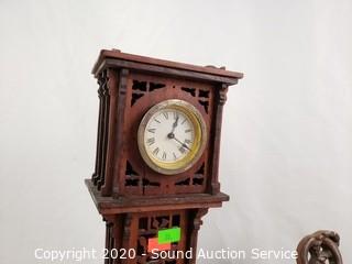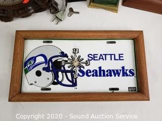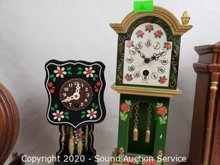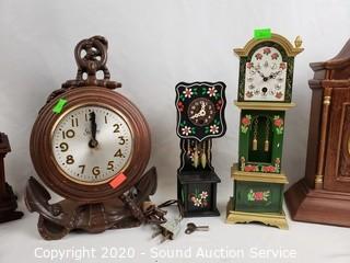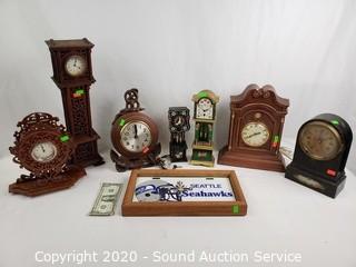 Lot Details: Includes Seattle Seahawks quartz wall clock, hand painted wind up mini pendulum clocks, carved wood miniature grandfather clock, vintage "The Terry Clock"? wind up, Sessions anchor clock and others. None are working.