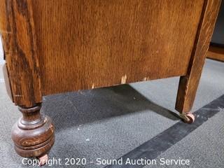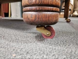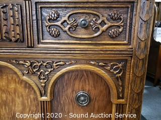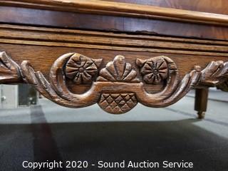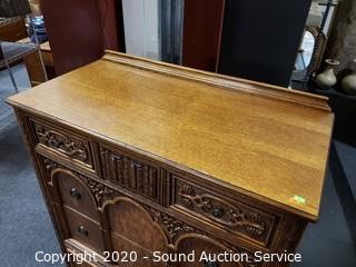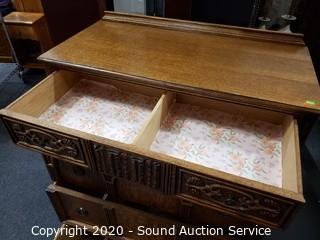 Lot Details: Ornately carved drawers and accents, top drawer is sectioned, on wood casters. 46.5" x 36" x 18". Has some very minor dings and knicks, otherwise in excellent condition, refer to photos. Matches the previous and next lots.
