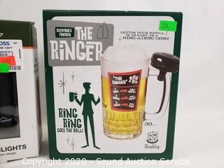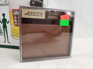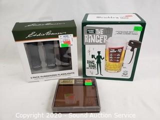Lot Details: Includes Amity trifold leather wallet, 3pk Eddie Bauer LED rubberized flashlights and The Winger Windley 20oz beer mug. All appear to be new.