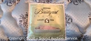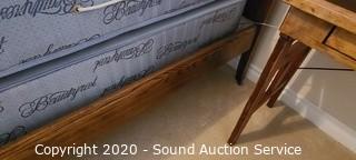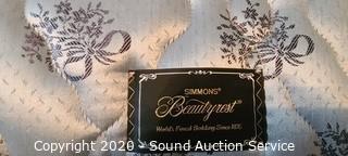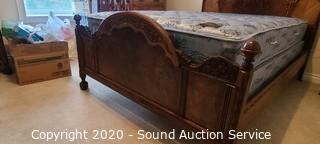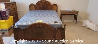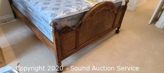 Lot Details: 43" and 31" headboard and footboard, comes with slats and side rails, on casters, ornately carved accents, notice a few knicks and chips in the wood, otherwise in great condition. Mattress and box spring are Simmons Beautyrest Luxury Firm, in good condition. Matches the previous lots.