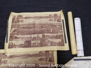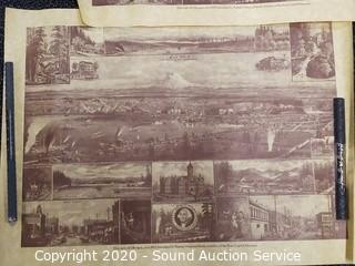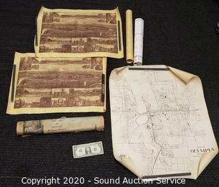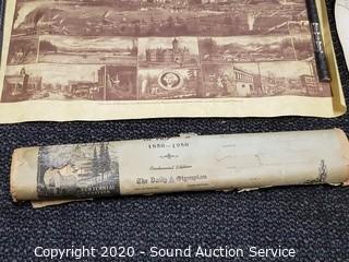 Lot Details: Newspaper is Centennial Edition 1850-1950, is very worn and unable to remove it from the sleeve. Maps are of Lacey and Olympia, c. 1960s. Comes with 3 "This View of Olympia, circa 1905, Rainier National Bank courtesy of the state Capitol Museum" prints.