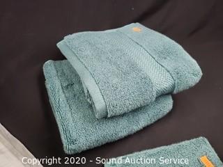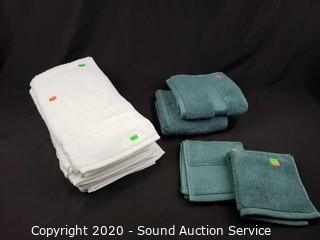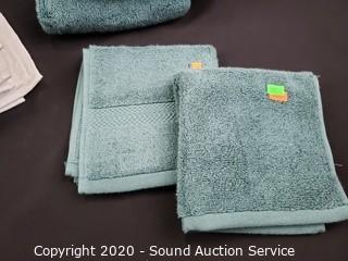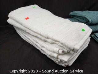 Lot Details: Includes 8 Grandeur Hospitality white cotton hand towels, 2 Turkish Finest green hand towels and 2 green wash cloths. Some loose threads on the white towels.