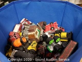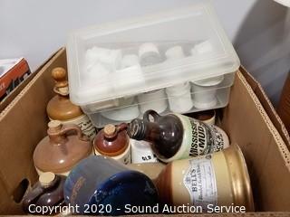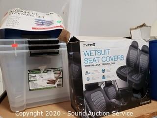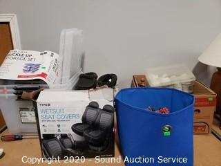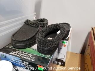 Lot Details: Includes toy cars, whiskey jugs, decanters and other vintage items, wetsuit seat covers, motion activated LED security lights, men's Dearfoams slippers size medium 9-10, Calm dietary supplement, clear plastic totes with lids (12.9qt and 45qt).