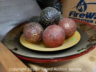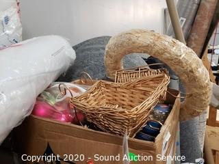 Lot Details: Includes vintage pendulum wall clock, throw pillows, holiday decor, spill response kits, air mattress, puzzles, centerpiece bowls, batting and decor.