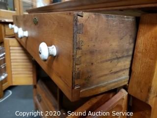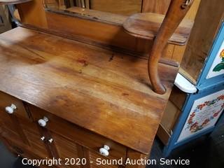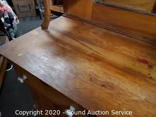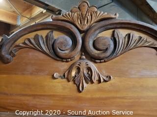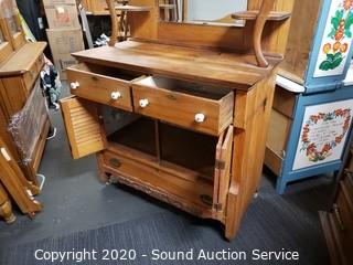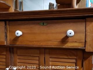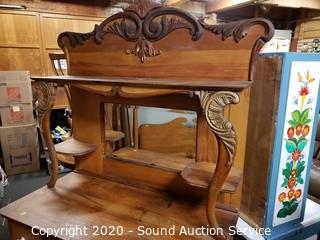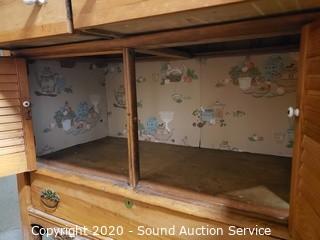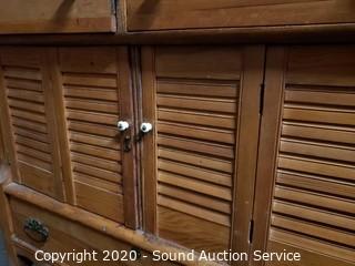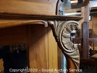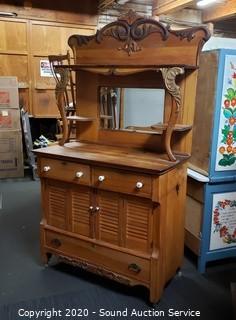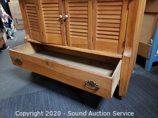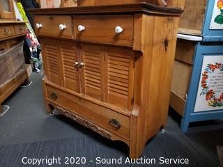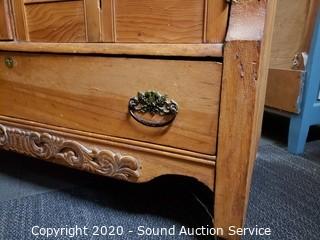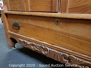 Lot Details: Ornate carved accents, 3 drawers with skeleton key locks (no keys), louver cabinet doors, beveled mirror, dovetail joinery, on plastic casters. 78" H x 42" W x 21" D. Various wear, refer to photos for condition.