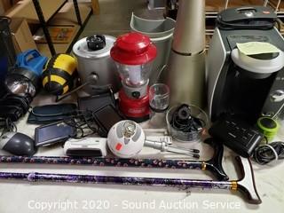 Lot Details: Includes canes, flashlight, Nerf football, lantern, hand vac and more.
