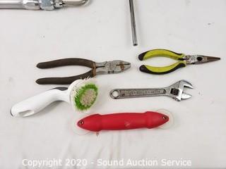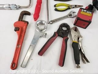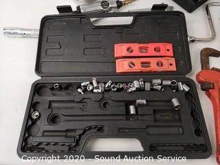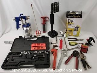 Lot Details: Includes rotary tool, 2 paint sprayers, torpedo level, pipe wrench and more.
