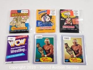 Lot Details: Also comes with two 1985 Hulk Hogan Cards. (2) 1980's Sealed Garbage Pail Kids Card pack & 1987 WWF Sealed Pack & 1990 WCW Sealed Pack.