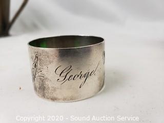 Lot Details: Napkin ring is monogrammed "George", floral etched, TW 22 grams. Token dispenser is marked JE Mergott Co.
