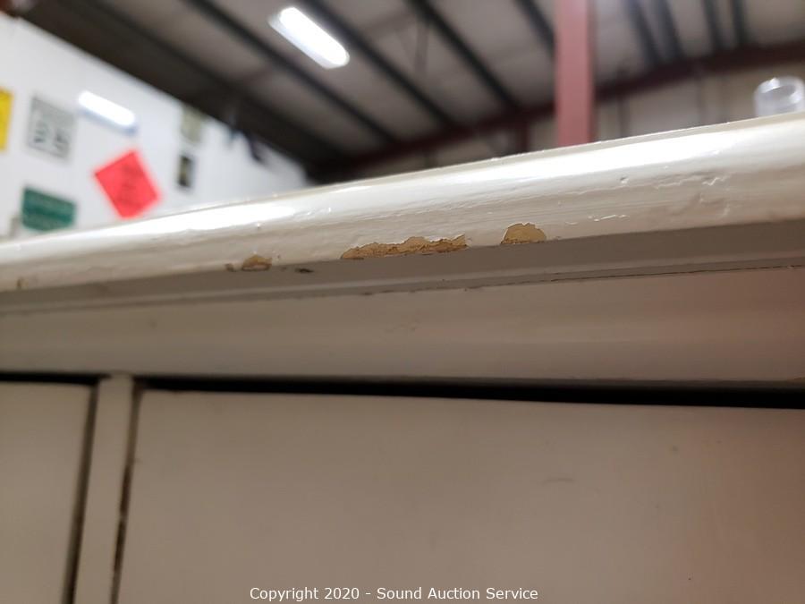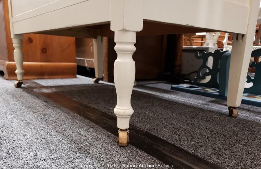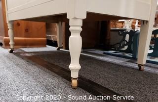 Lot Details: Solid wood construction, wood casters. Matches the previous lot. Refer to photos for condition. 43" H x 36" W x 19" D.