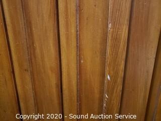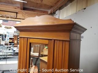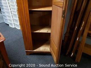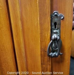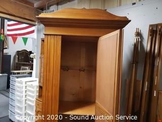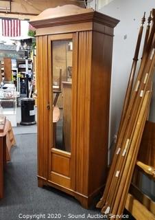 Lot Details: Skeleton key lock, no key. Solid wood construction. Coat hat hooks inside. 82" H x 30" W x 16" D. Refer to photos for condition.