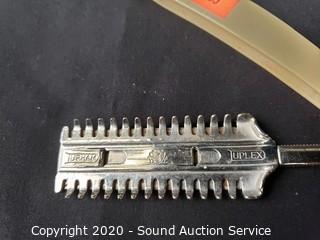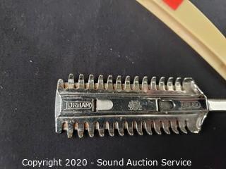 Lot Details: Brushes, mirrors, powder boxes, hair clip, manicure items, razor, trays and more.