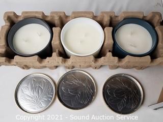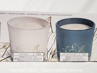 Lot Details: Soy blend wax, artisan fragrances with pure essential oils, 20oz candles. Fresh Fig & Amber, Vanilla & Chai and White Aspen & Juniper scents.