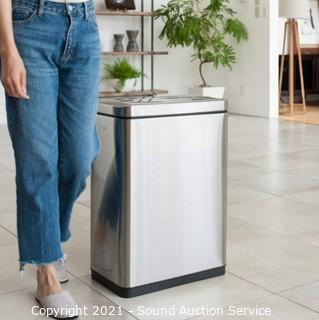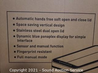 Lot Details: The stainless steel panels of the dual-wing top of our DELUXE PHANTOM Motion Sensor touchless trash can give a sharp, streamlined appearance. Soft close design, removable liner. 26" H x 18" W x 10.6" D. Works, in original packaging, opened to verify contents. Model EK9287.