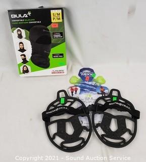 Lot Details: Snow Trax are men's size 3.5 - 7.5, women's size 5-9, lightly used. Balaclava is size S/M, like new.