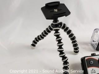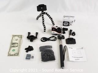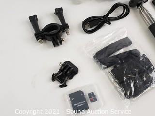 Lot Details: 1080p HD. Comes with selfie stick, tripod, waterproof case, SD cards, instruction manual and mount. Works, complete.