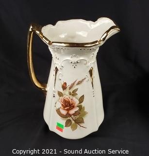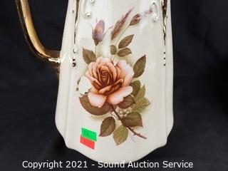 Lot Details: Rose print with gold painted accents. Some crazing and some wear to the paint, refer to photos. 3.75" x 15" diameter basin, 11" x 7" diameter pitcher.