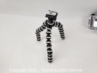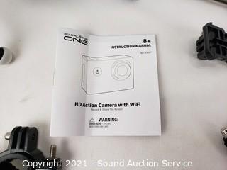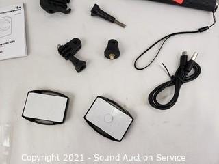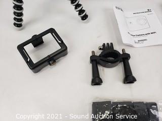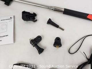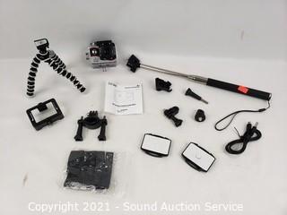Lot Details: Works, complete, no packaging. Comes with waterproof case, tripod, selfie stick, surface mount, SD cards. 1080p full HD.