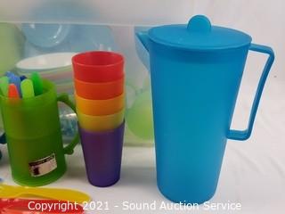 Lot Details: Cups, plates, bowls, pitcher, trays, utensils.