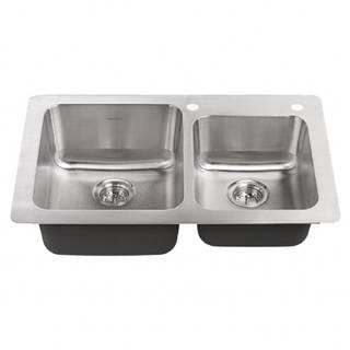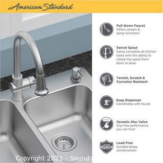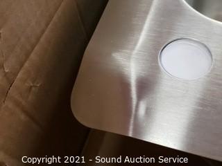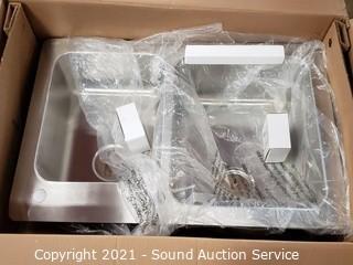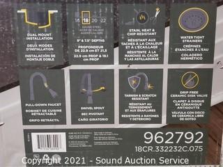 Lot Details: Brand new. Stainless steel, 2 hole, 33" x 22" x 9" D. Comes with pull down faucet, strainers & soap dispenser. Model 962792. Top right corner is slightly dented, otherwise like new, complete.