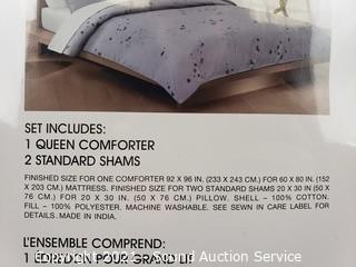 Lot Details: 92" x 96" comforter and (2) 20" x 30" shams, 100% cotton, gray floral print, factory sealed.