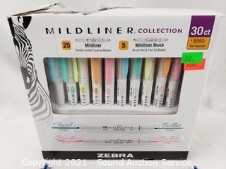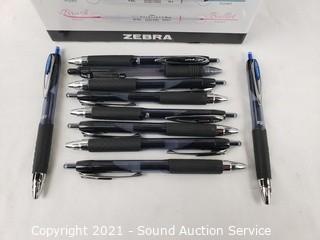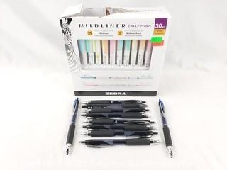 Lot Details: 9 black and 2 blue UniBall pens, 30pk Zebra Mildliner Collection brush pens.