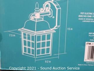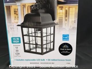 Lot Details: Oil rubbed bronze finish. Previously installed, no issues, comes with mounting bracket & bulb. 15" H x 7.5" W x 9.2" D.
