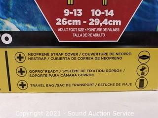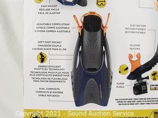 Lot Details: Men size 10-13, women's size 11-14. Includes 1 mask, 1 snorkel, 2 fins, 1 strap cover and travel bag.