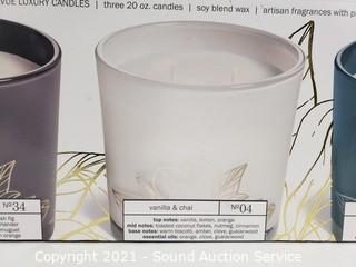 Lot Details:  All new, unused. Fresh Fig & Amber, Vanilla &  Chai and White Aspen & Juniper scents. 20oz  candles, soy wax blend.