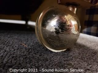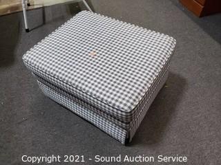 Lot Details: Do not see a brand. Ottoman is rolling, has a tear in the fabric on the under side. Refer to photos for condition. 33" x 30.5", 19" to seat. 12.5" x 22" x 27" ottoman.