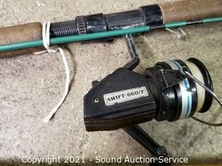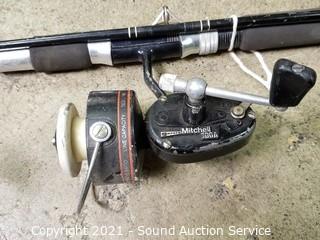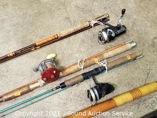Lot Details: Pole spear has a slip tip, 52" long. 22" & 32" wood & aluminum handle gaf hooks. Wright McGill 8ft fiberglass rod with Penn Peer No.109 reel. 5.5ft rod with casting reel, Diawa 8.5ft rod with Berkley 412 reel, & 7ft rod with Garcia Mitchell 300A reel.