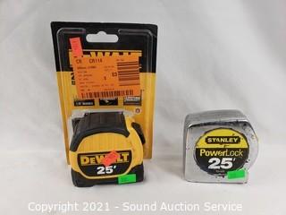 Lot Details: Both tape measures are 25ft, Dewalt won't stay locked, Stanley has some wear, stud sensor works.