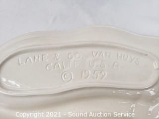 Lot Details: Includes Brush canister and Lane & Co. Van Eyes 1959 serving platter. 8" x 12" x 6.5" and 20" x 15" platter.