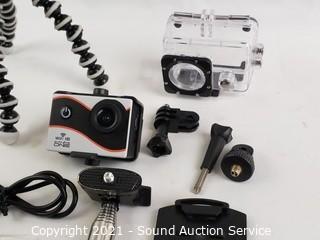 Lot Details: 1080p HD. Comes with selfie stick, tripod, waterproof case, SD cards, instruction manual and mount. Works, complete.
