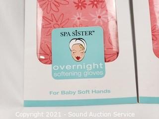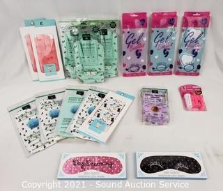Lot Details: Includes moisturizing foot socks, soft hands gel gloves, overnight softening gloves, gel booties, ear plugs and eye masks.