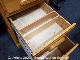 Lot Details: Top is locking with keys. Bottom drawers are also locking but do not have keys. Left bottom can hold a computer tower, roll top is big enough to hold a monitor, with cord holes. 54" H x 60" W x 36" D. Some minor wear, overall good condition.