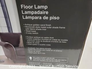 Lot Details: Base has some scuffs and scratches. Antique golden sand finish. 4-way switch. Works, unassembled in original box. 73" H x 18" Dia.