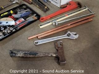 Lot Details: Pipe wrenches, flat bars, hatchets, faucet, copper tubing & more.