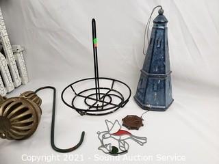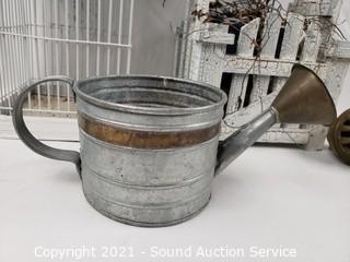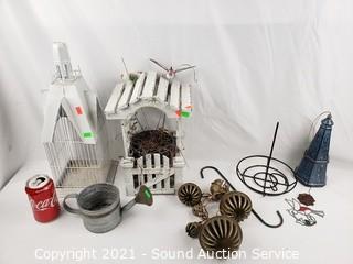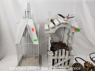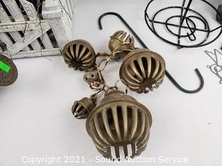 Lot Details: Water well planter, bird cage, India brass string of bells, porcelain bell, watering can.
