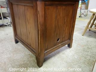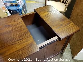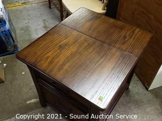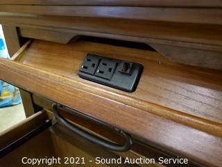 Lot Details: Matches the previous & next lots. Top drawer folds down to reveal 2 power outlets, and phone line, top slides open to reveal hidden storage. In good condition. 25" H x 24" W x 27" D.